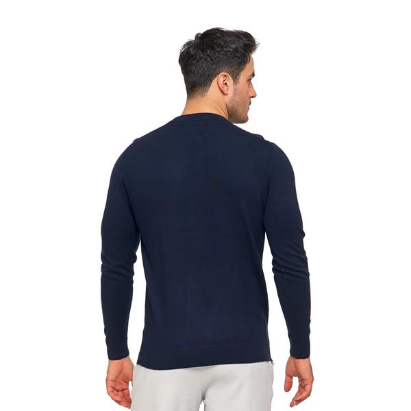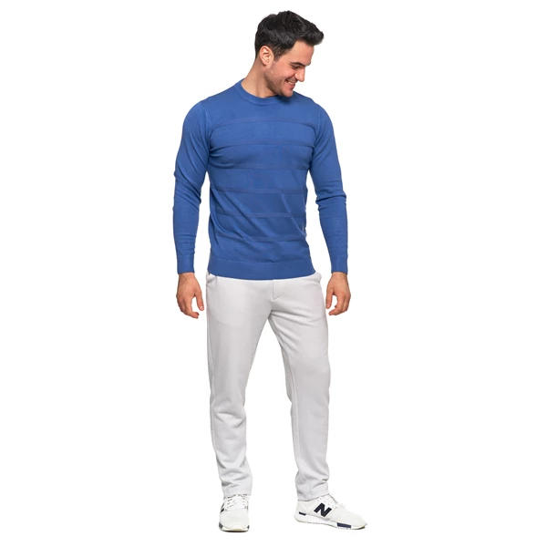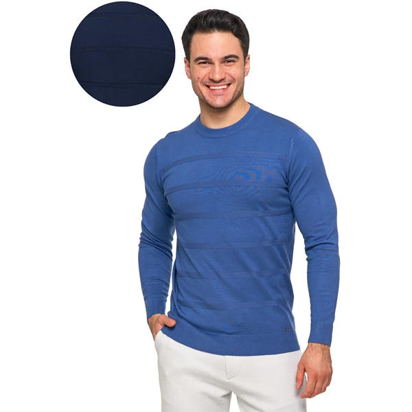 Wykonany z wysokiej jakości wiskozy z domieszką, oferuje miękki i elastyczny materiał, który doskonale dopasowuje się do sylwetki, zapewniając maksymalny komfort noszenia i wytrzymałość. Sweter posiada okrągły dekolt oraz wykończenia z nieuciskającymi ściągaczami, co dodatkowo zwiększa jego wygodę. Unikalnym elementem designu są wytłoczenia na przodzie, które imitują paski, nadając swetrowi nowoczesny i stylowy wygląd. Ten wszechstronny sweter doskonale sprawdzi się zarówno w codziennych stylizacjach, jak i podczas bardziej formalnych okazji, dodając subtelnego uroku i klasy każdemu męskiemu zestawowi.