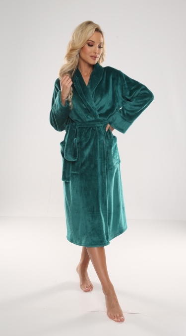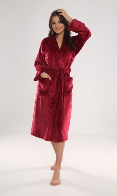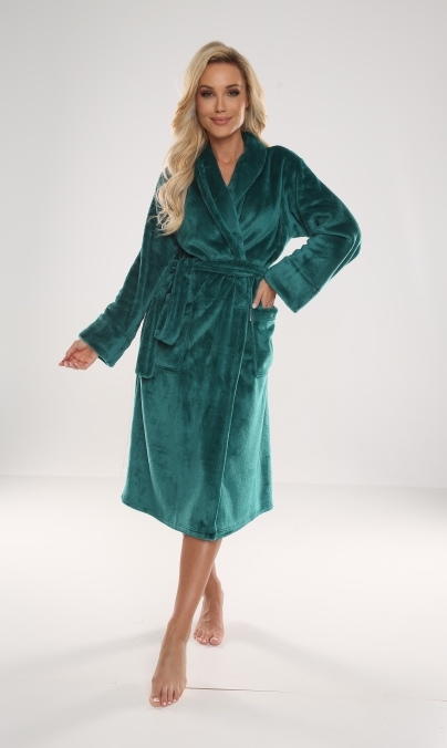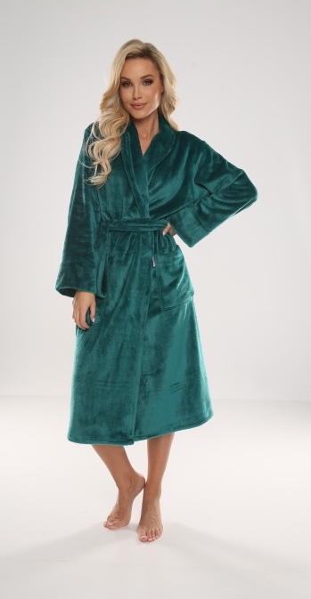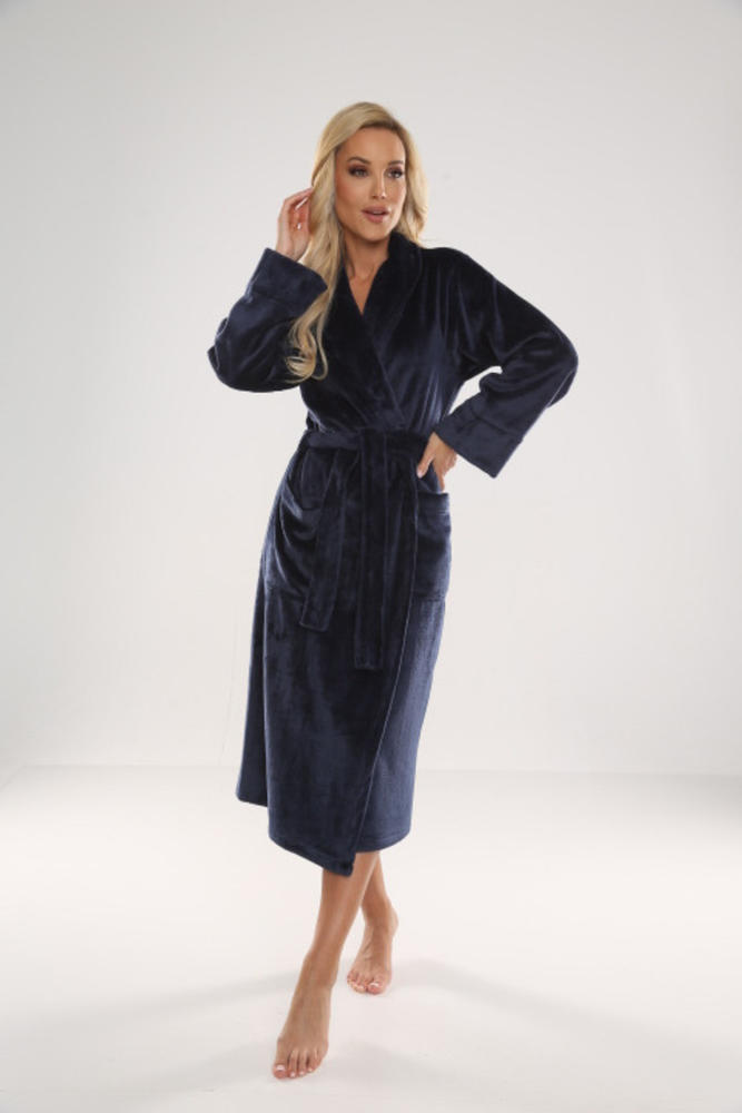 Szlafrok damski długi z szalowym kołnierzem, z miękkiej dzianiny typu soft. Wiązany w pasie, z kieszeniami.