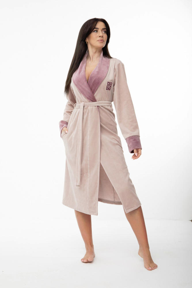 Długi szlafrok damski uszyty z miękkiego weluru. Wiązany w pasie z długim rękawem. Kołnierz oraz rękawy obszyte kontrastującym materiałem. Na wysokości bioder kieszenie. Na wysokości kaltki piersiowej ozdobny haft