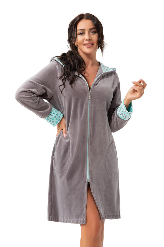 Krótki szlafrok damskie z kapturem zapinany na zamek uszyty z bawełny z dodatkiem poliestru. Kaptur oraz rękawy wykończone kontrastującym materiałem. Na wysokości bioder kieszenie.
