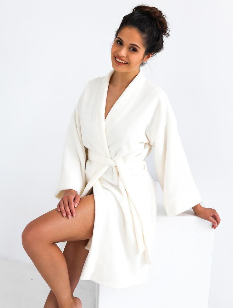 Krótki szlafrok damski długi rękaw z miękkiej, przyjemnej w dotyku froty bambusowej, wiązany w pasie, z kieszeniami.