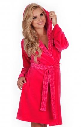 Szlafrok damski długi, z kapturem, wiązany w pasie. Wykonany z miękkiego weluru, kaptur od wewnątrz zdobiony białymi kropeczkami.