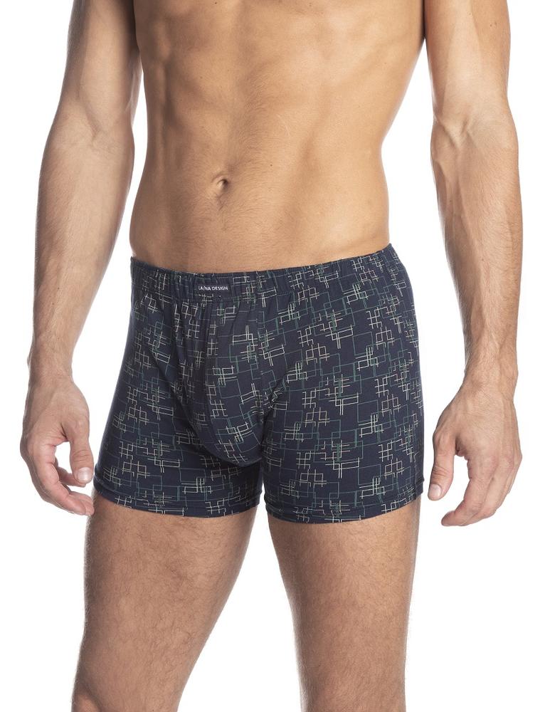 Szorty męskie M-957SZ z firmy Lama z naturalnej bawełny o klasycznym fasonie w kolorze granatowym, z nadrukiem. W pasie wygodna, szeroka guma w tunelu. Krój zaprojektowany z myślą o zapewnieniu doskonałego komfortu w każdej sytuacji. Płaskie łączenie szwów, bezuciskowe wykończenie nogawek.