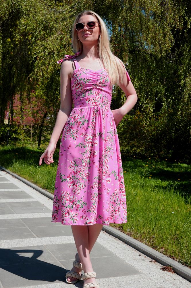 Sukienka wyróżnia się efektownym wiązaniem ramiączek, które doda dziewczęcego wdzięku każdej stylizacji. Jej krój podkreśli talię i okolice dekoltu. Luźno puszczona tkanina doda lekkości całości.