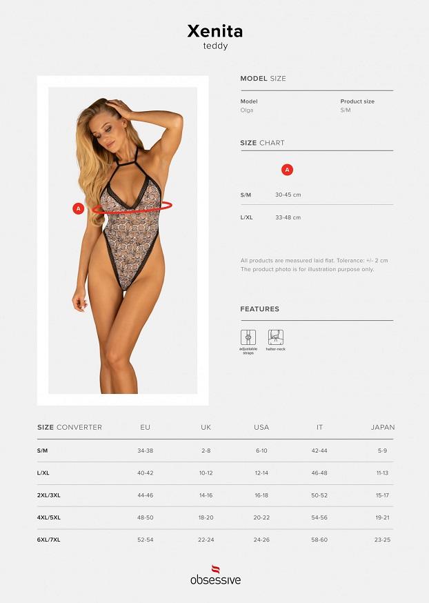 Odrobina dzikości, szczypta kobiecości i krzta elegancji to połączenie idealne! Najlepszym tego przykładem jest baaardzo zmysłowe body z kolekcji Xenita, które kusi kobiecym fasonem i zachwyca nieprzeciętnymi wzorami. Fenomenalnie podkreśli kształty i pozwoli poczuć się zjawiskowo pięknie podczas gorących wieczorów z ukochanym! Masz ochotę na więcej? Sprawdź wszystkie detale: wyjątkowe body Xenita, zmysłowe, zwierzęce wzory – pikantne doznania. Kuszący dekolt – piękny wygląd piersi, regulowane zapięcie na szyi zdobione paseczkiem – dodaje charakteru. Regulowane zapięcie na plecach – komfort i wygoda noszenia. Dwa regulowane paseczki wzdłuż linii pleców – możliwość idealnego dopasowania, koronkowe wykończenia – dodają elegancji. Elastyczny i przyjemny materiał.